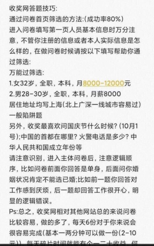 问卷开头万能过筛选信息:男28岁,工作经验5-8,月薪8000;或者女32经验5-8年居住地北上广深
